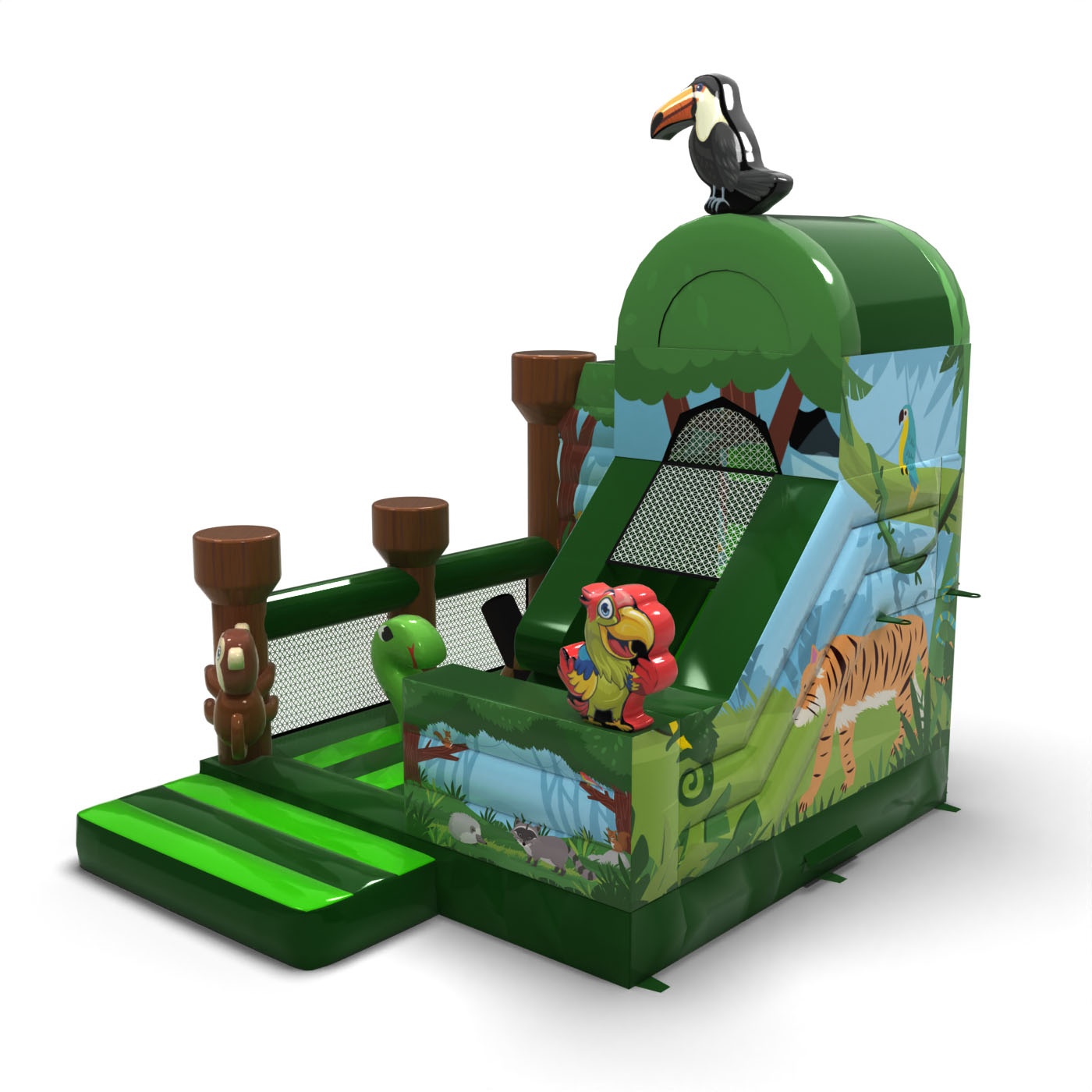 Odkryj dziką przygodę w sercu dżungli dzięki naszej dmuchanej zjeżdżalni w kolorowym motywie dżungli! Zapewnij swoim małym odkrywcom niezapomniane chwile pełne radości i zabawy w bezpiecznym otoczeniu. To idealny dodatek na eventy i festyny w plenerze, który zachwyci dzieci i przyniesie wiele uśmiechu na ich twarze!